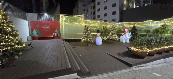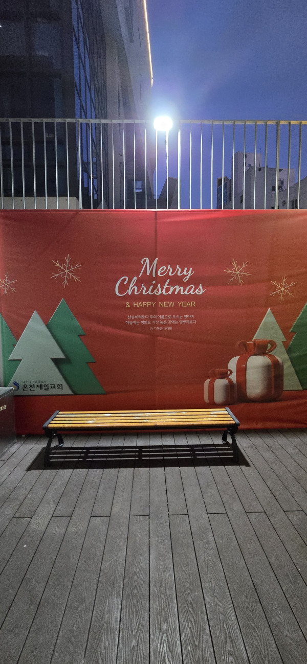 교회 테라스에 크리스마스 트리 작업했는데, 현수막의 결과물이 너무 좋습니다.
